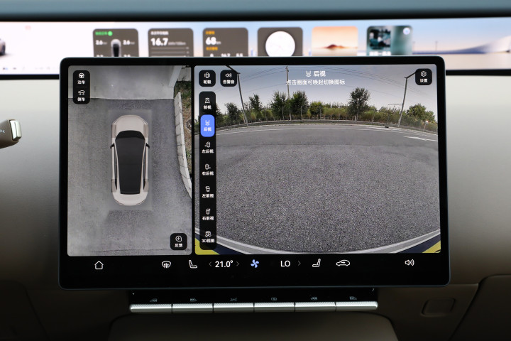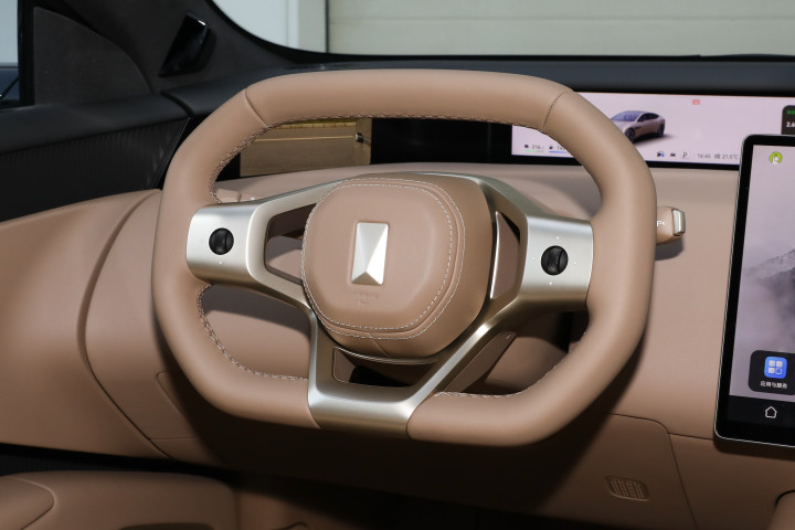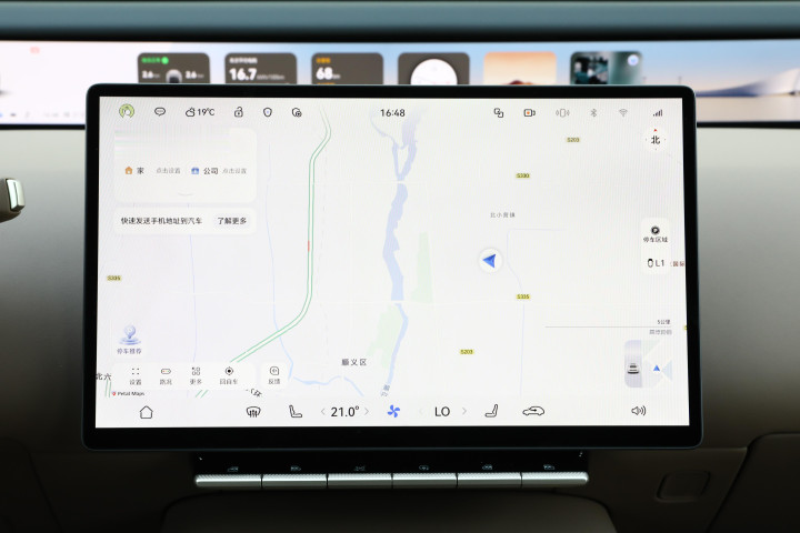 坐进车内,第一眼会被岩棕内饰吸引。这种色调灵感源自阳光晒过的岩石和肥沃土壤,低饱和度、暖色调,搭配黑色顶棚和线性桦木饰板,整体氛围沉稳而不沉闷。细节处点缀的柔和金色饰条,又增添了一丝精致感。中控区域没有物理按键,几乎全部功能集成在鸿蒙座舱 HarmonySpace 5系统中。15.6英寸中控屏+13.3英寸仪表盘+35.4英寸全景远端屏的组合,信息显示丰富,操作逻辑清晰。HarmonySpace 5的流畅度和语音识别准确率都属上乘,支持多设备无缝流转,比如手机上的导航可以直接“甩”到车机上继续使用。
